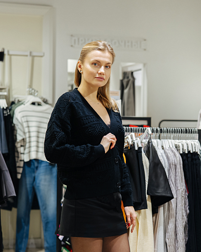 Кстати, ажурную интересную вязку сейчас встретить достаточно тяжело - такие варианты мы нашли в магазине Conte - свитер в молочном цвете и кардиган в тёмно-синем глубоком оттенке.